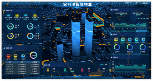 例如下圖所示的智慧物業(yè)駕駛艙,內容有:預付費、充電樁、電梯、空調、照明等設備管理、能耗統(tǒng)計、收益統(tǒng)計、運維情況等。其中百度地圖可以選配成BIM建筑模型,任何傳感器報警時可以在BIM模型中預警顯示。