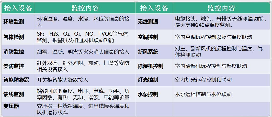 當(dāng)檢測(cè)到環(huán)境量出現(xiàn)異常時(shí),可及時(shí)顯示、報(bào)警,并可通過通信網(wǎng)絡(luò)將數(shù)據(jù)上傳至系統(tǒng)平臺(tái)。根據(jù)預(yù)先設(shè)置的上下限值,聯(lián)動(dòng)控制空調(diào)、視頻、燈光、加熱裝置、除濕器、通風(fēng)機(jī)、聲光報(bào)警等設(shè)備。保障配電室場(chǎng)所的電力設(shè)備安全運(yùn)行。防止因環(huán)境改變、非授權(quán)活動(dòng)、設(shè)備狀態(tài)變化等引起的事故,滿足配電室遠(yuǎn)程運(yùn)維的可靠管控要求。為新型現(xiàn)代化配電室的智能化、可視化、自動(dòng)化、互動(dòng)化做有效支撐。