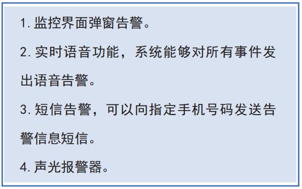 告警功能:在監(jiān)控中心對(duì)環(huán)境參量超過預(yù)設(shè)值時(shí)發(fā)出視聽告警,在監(jiān)控系統(tǒng)的人機(jī)界面上閃爍顯示,同時(shí)可以提供警示燈、報(bào)警音箱、語音、短信通知等多種告警方式。