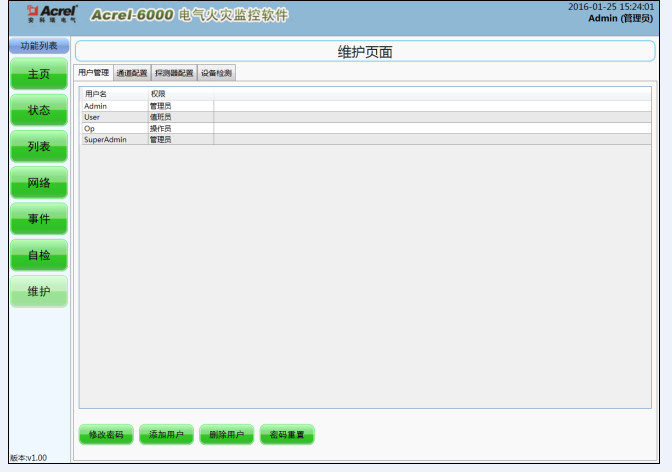 該界面可添加新的“操作員”和“值班員”權(quán)限的新用戶,也可刪除這兩個(gè)級(jí)別的現(xiàn)有用戶,該管理功能只有“超級(jí)管理員”和“管理員”可進(jìn)行操作。