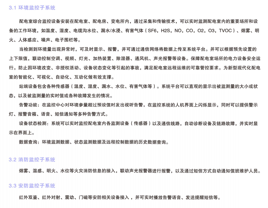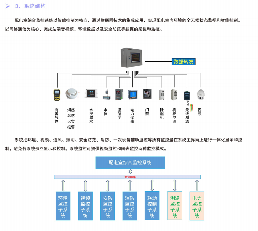 配電室綜合監(jiān)控是整個電能管理系統(tǒng)中的一個重要環(huán)節(jié),一般以低壓網(wǎng)中的配電室環(huán)境溫濕度、配電開關狀態(tài)、漏水/水浸、煙霧及配電室的防盜為監(jiān)測對象,對配電房重要設備運行狀態(tài)的多種參數(shù)和狀態(tài)進行本地聯(lián)動控制、遠程集中監(jiān)控、手機短信報警。配電室的全信息采集和監(jiān)控對配電室自動化運行管理、檢修維護、防災預警、安全防護、電力需求管理等應用具有重大意義。